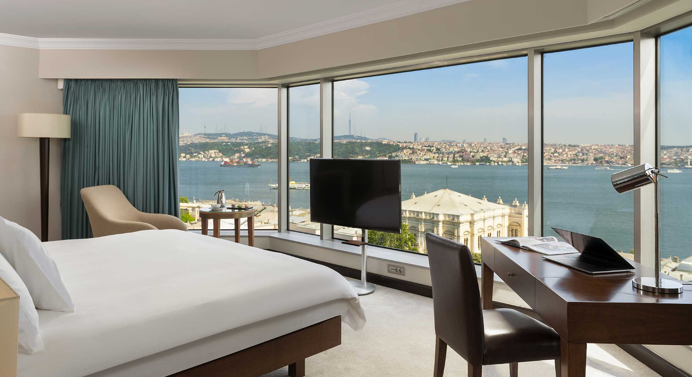 2 bedroom Bosphorus view corner suite (97-103 кв. м): гостиная с обеденной зоной, кухня, спальня с кроватью king-size, ванная комната с ванной и душем, гостевой туалет. Расположены в угловой части здания. Панорамный вид на пролив Босфор.