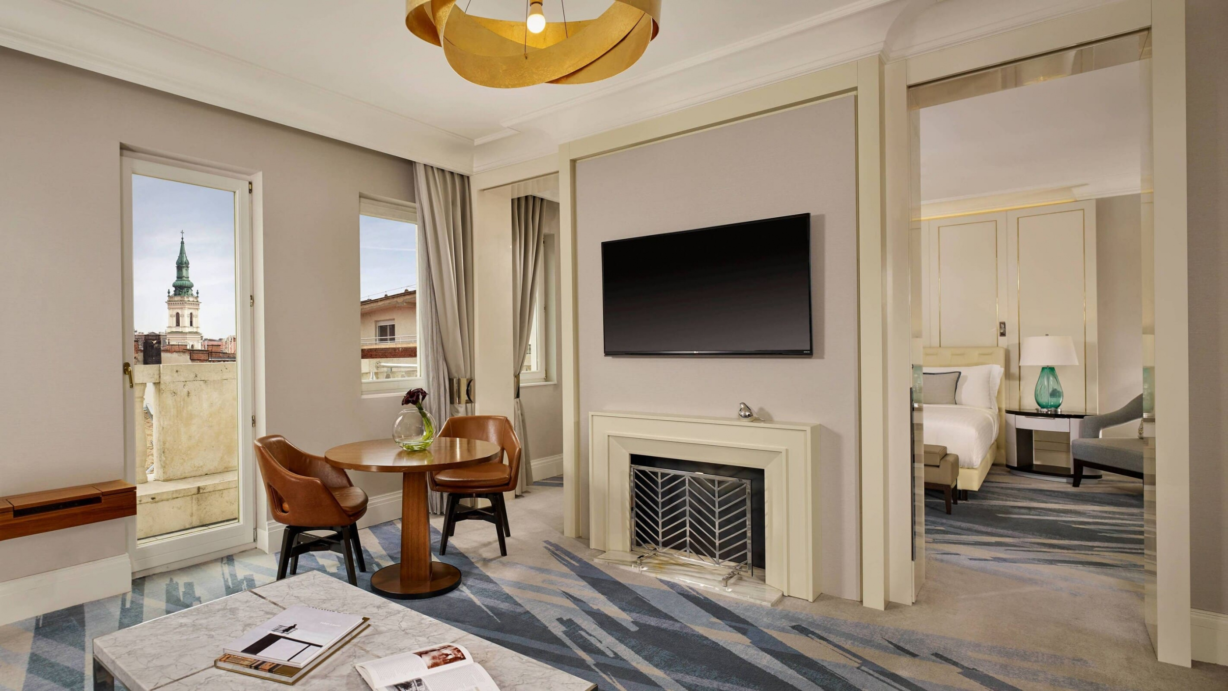 Junior suite (58 кв. м): гостиная, спальня с кроватью king-size, ванная комната с ванной и душем, гостевой туалет. Вид на парк или на соседние улицы.
