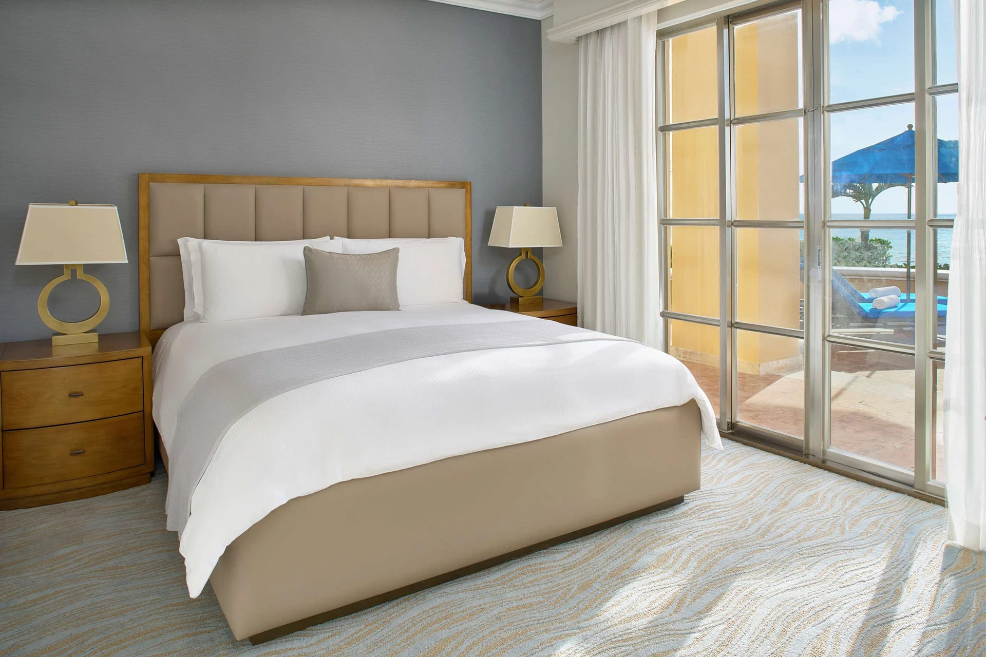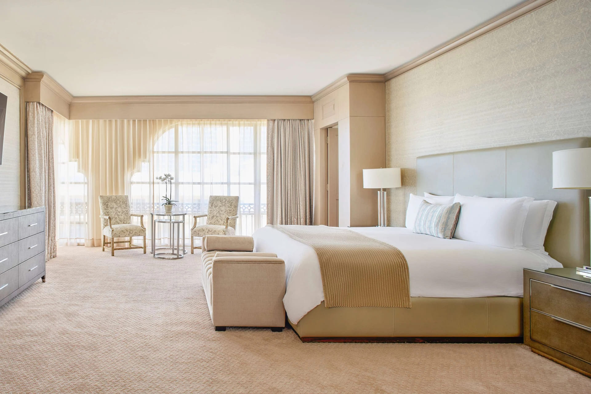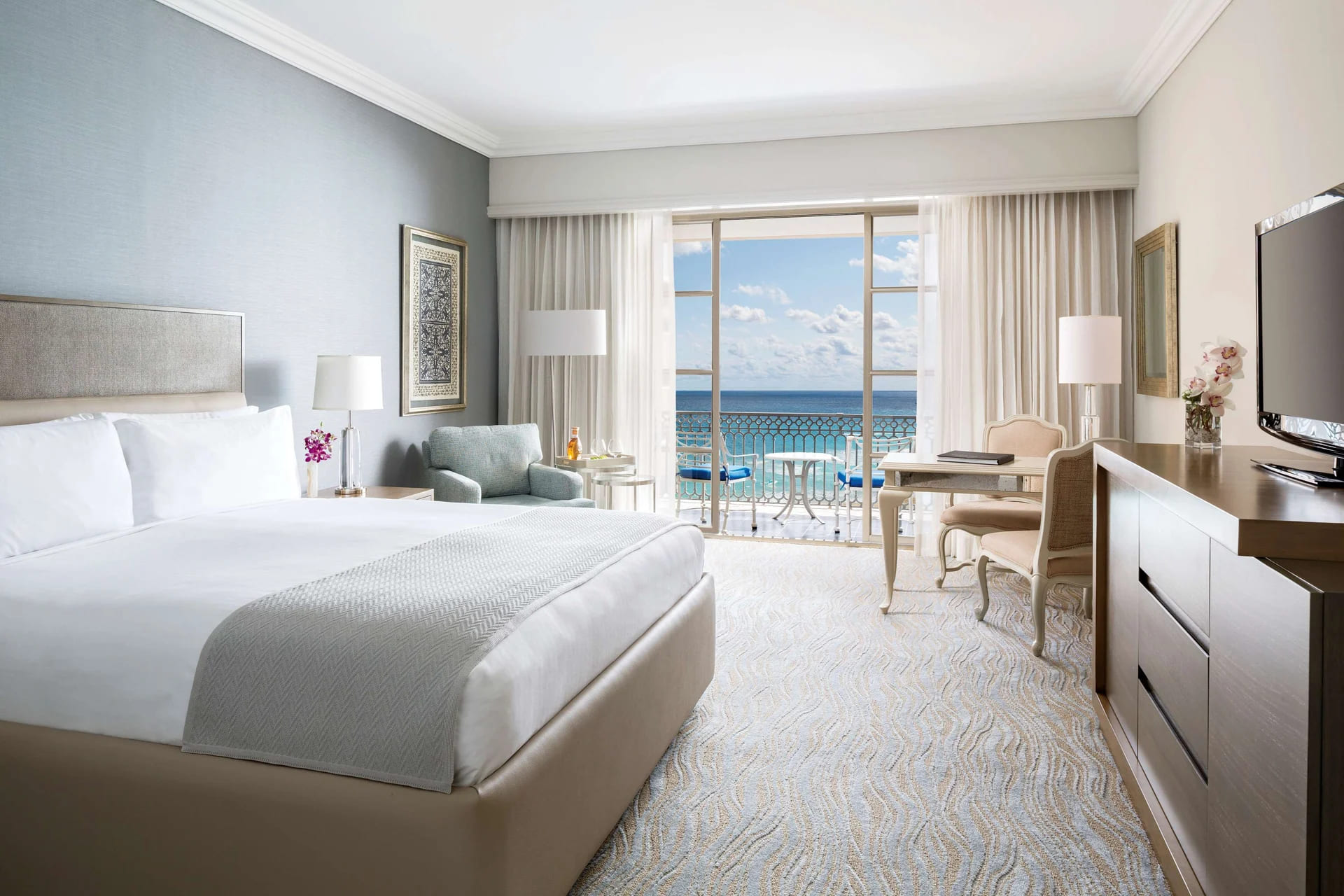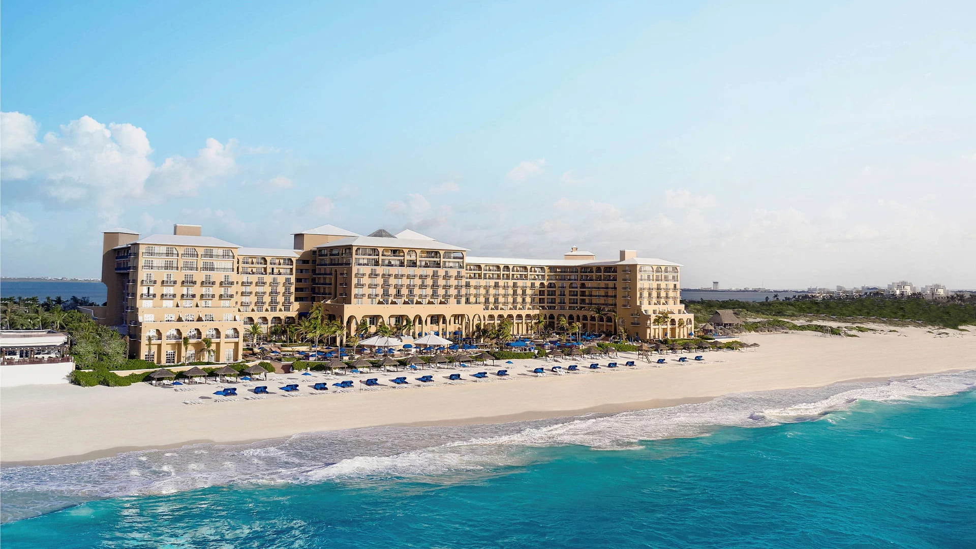 Элегантные номера отеля Ritz-Carlton Cancun располагают мини-баром и письменным столом. С балконов открывается вид на океан. В собственной ванной комнате к вашим услугам халат, тапочки и фен.