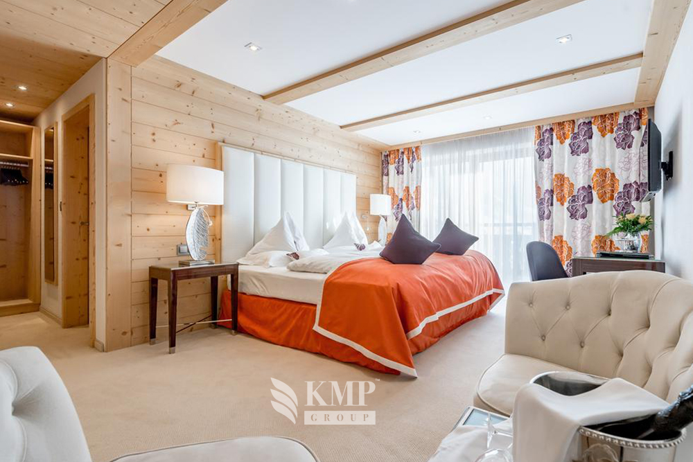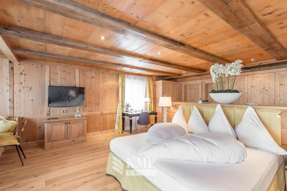 Double Room Deluxe: 40 м2. Состоит из спальни, гостиной зоны (в некоторых номерах — отдельной) с тирольской печью, ванной комнаты, туалетной комнаты, балкона.