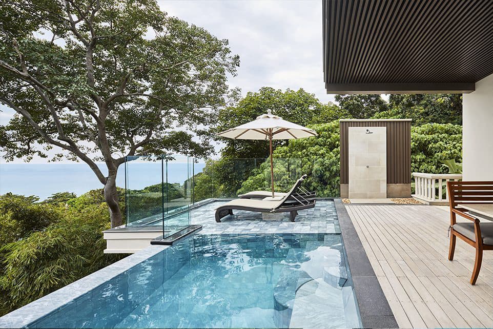 Ocean view pool room (117 кв. м). Терраса с открытым персональным бассейном (4 кв. м), спальня с кроватью king-size или двумя отдельными кроватями, гардеробная зона, ванная комната с ванной, душевой кабиной и душем на открытом воздухе. Вид на океан.