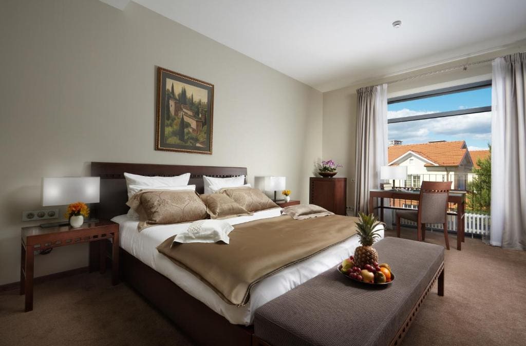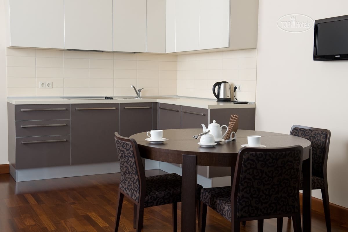Deluxe apartment (70 кв. м). Двухкомнатные номера Deluxe apartment расположены в корпусах B и С. В номере: прихожая со шкафом для одежды и зеркалом, гостиная с диваном, спальня с двухместной кроватью, ванная комната с современной душевой кабиной и ванной, феном, биде и теплым полом с регулировкой нагрева. Максимум в номере может разместиться 4 человека (по два в гостиной и спальне). Внутреннее оснащение: «умная» система освещения, рабочий стол, шторы с автоуправлением.