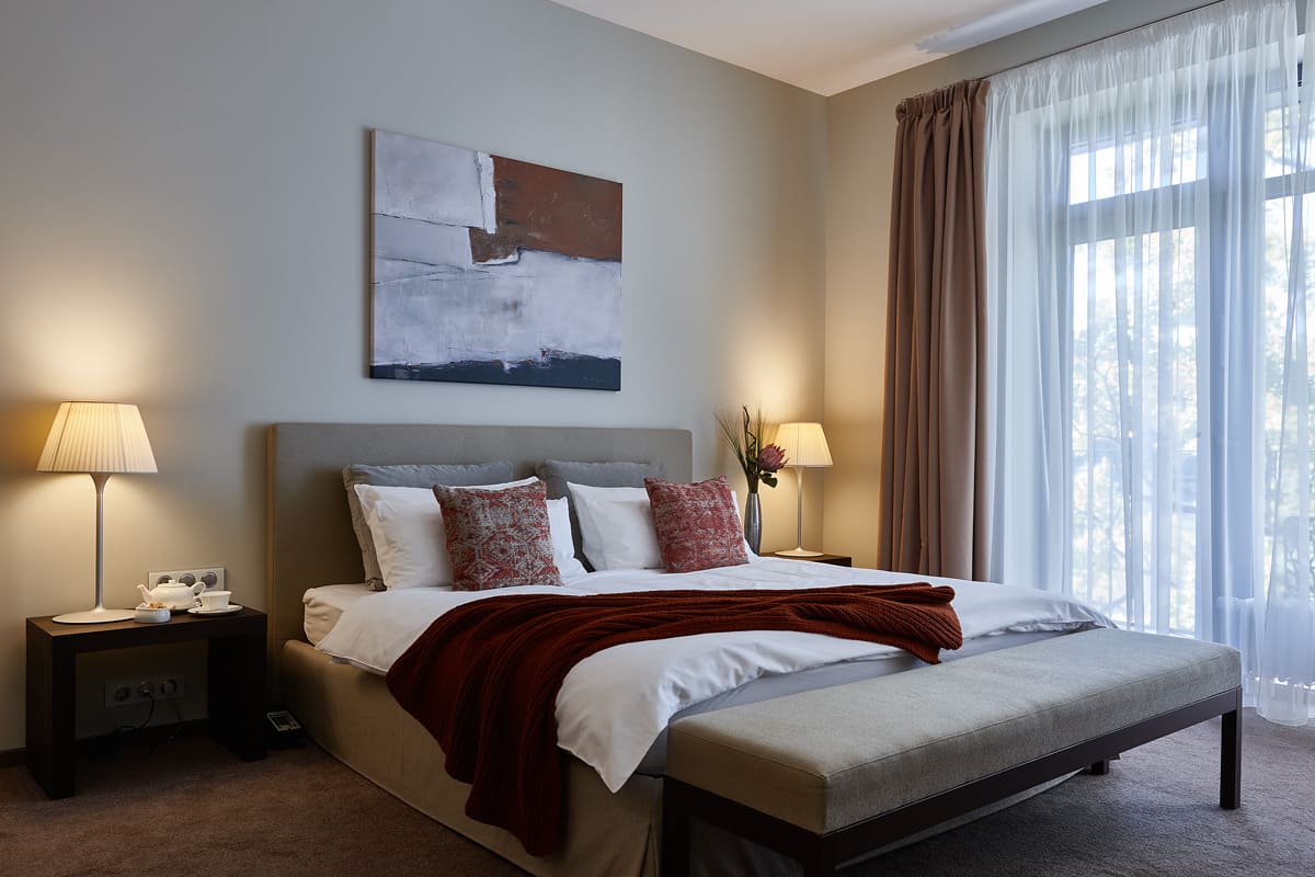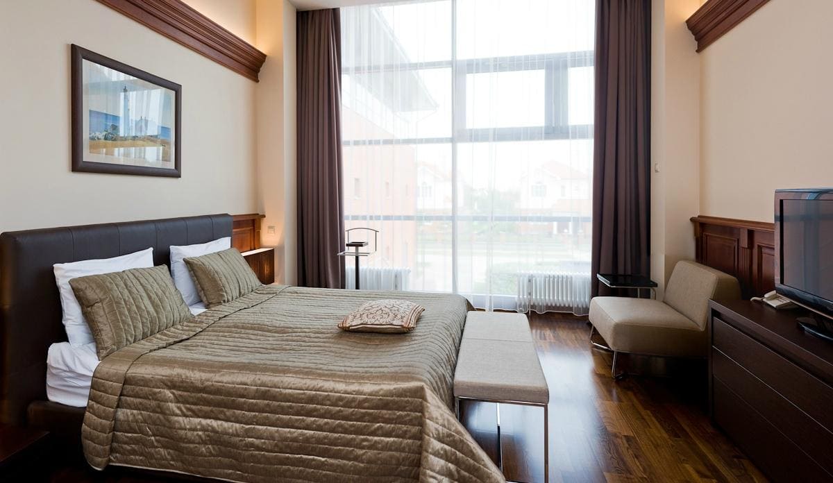 Deluxe (45 кв. м). На первом, втором и третьем этажах в новом корпусе отеля расположились номера категории Deluxe. Предусмотрена гостиная с диваном, лоджия, светлая спальня с большой двухместной кроватью, ванная. В ванной комнате установлена удобная душевая кабина и биде, есть фен и теплый пол с возможностью регулировки температуры. Максимальное число гостей — 4. Оснащение: освещение по системе «умный дом», прихожая со шкафом для одежды и зеркалом, рабочая зона.