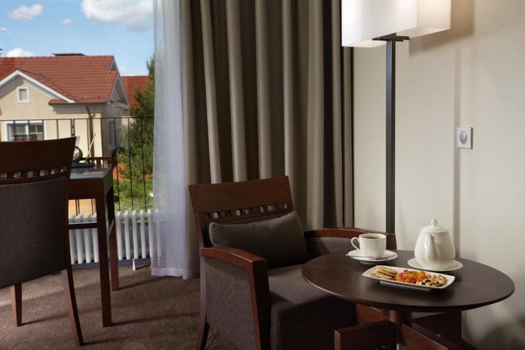 Luxe with balcony (70 кв. м). На втором этаже корпуса D располагается два номера категории Luxe with balcony с видом на опушку леса. Это двухкомнатные номера. В номере есть спальня с большой двухместной кроватью, кухня-гостиная с установленным в ней диваном, лоджия и ванная комната. В ванной есть современная душевая кабина, биде, фен и теплый пол. В номере может разместиться до 4 гостей: двое на основных местах и двое на дополнительных.