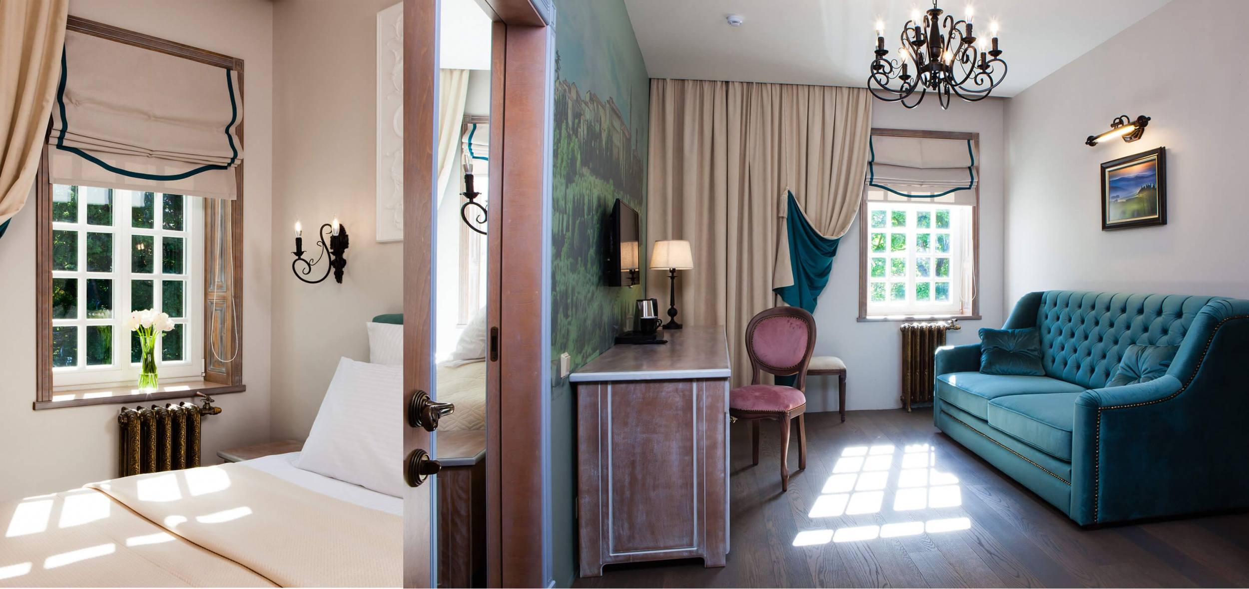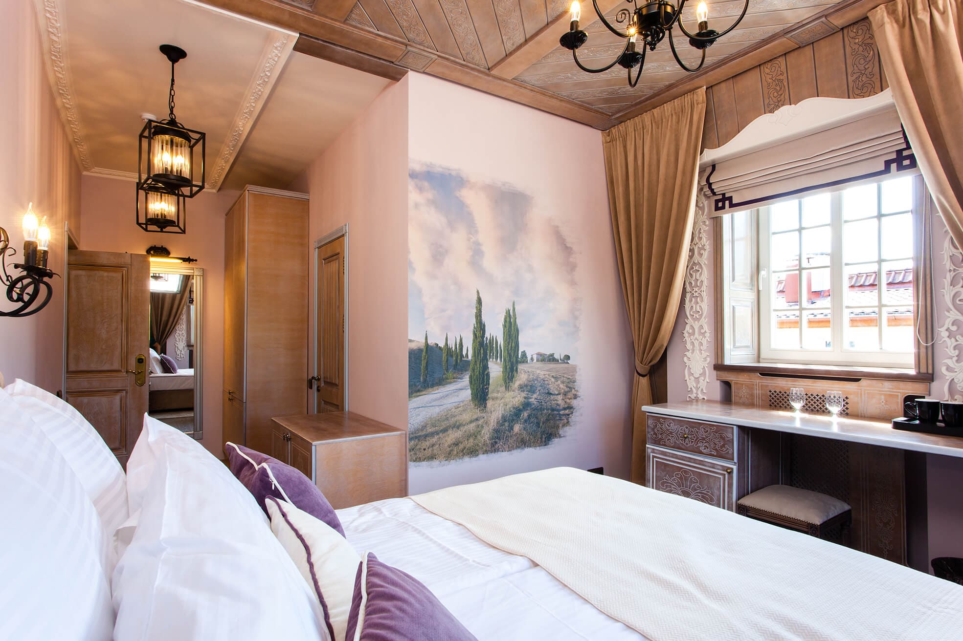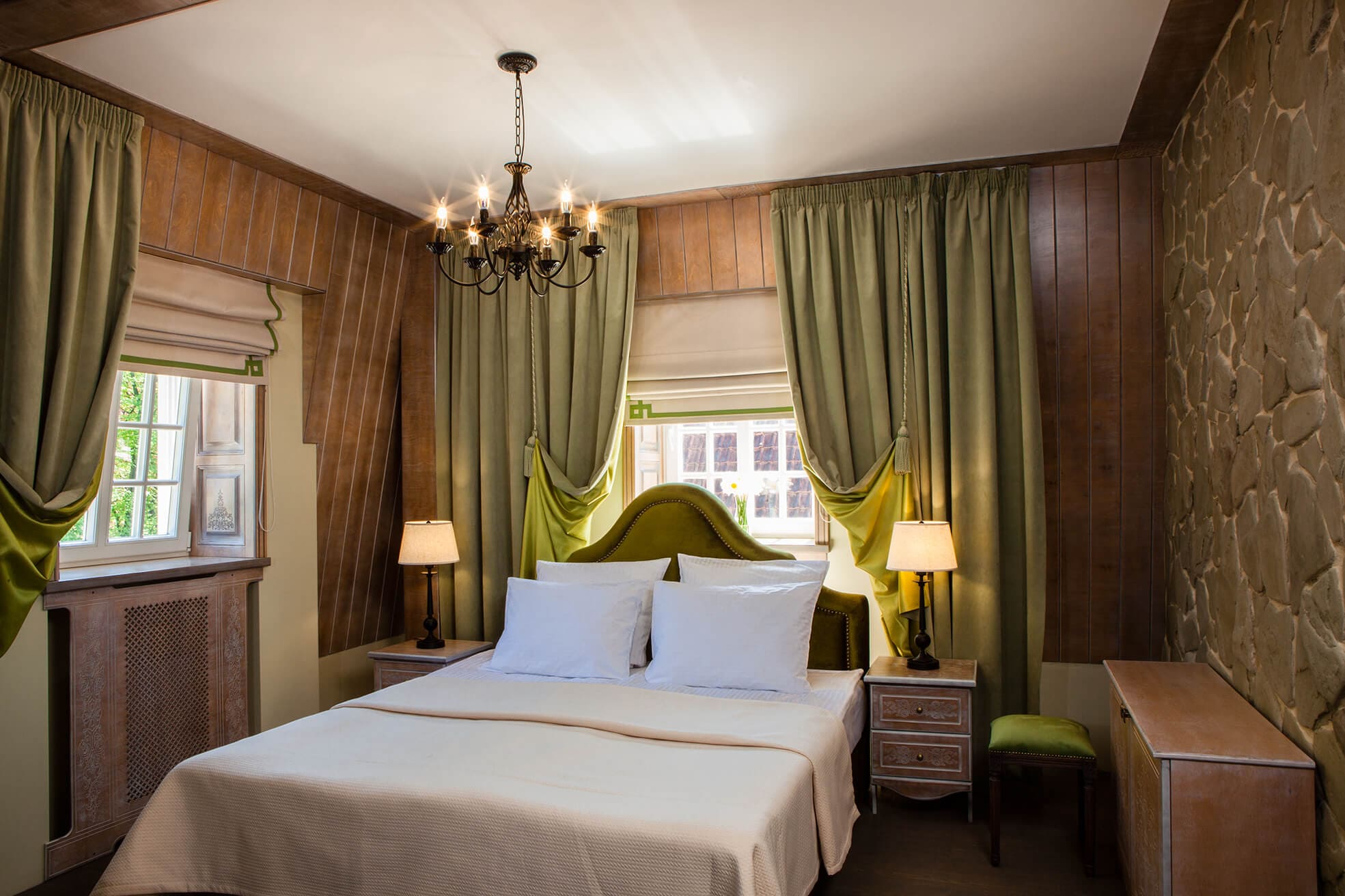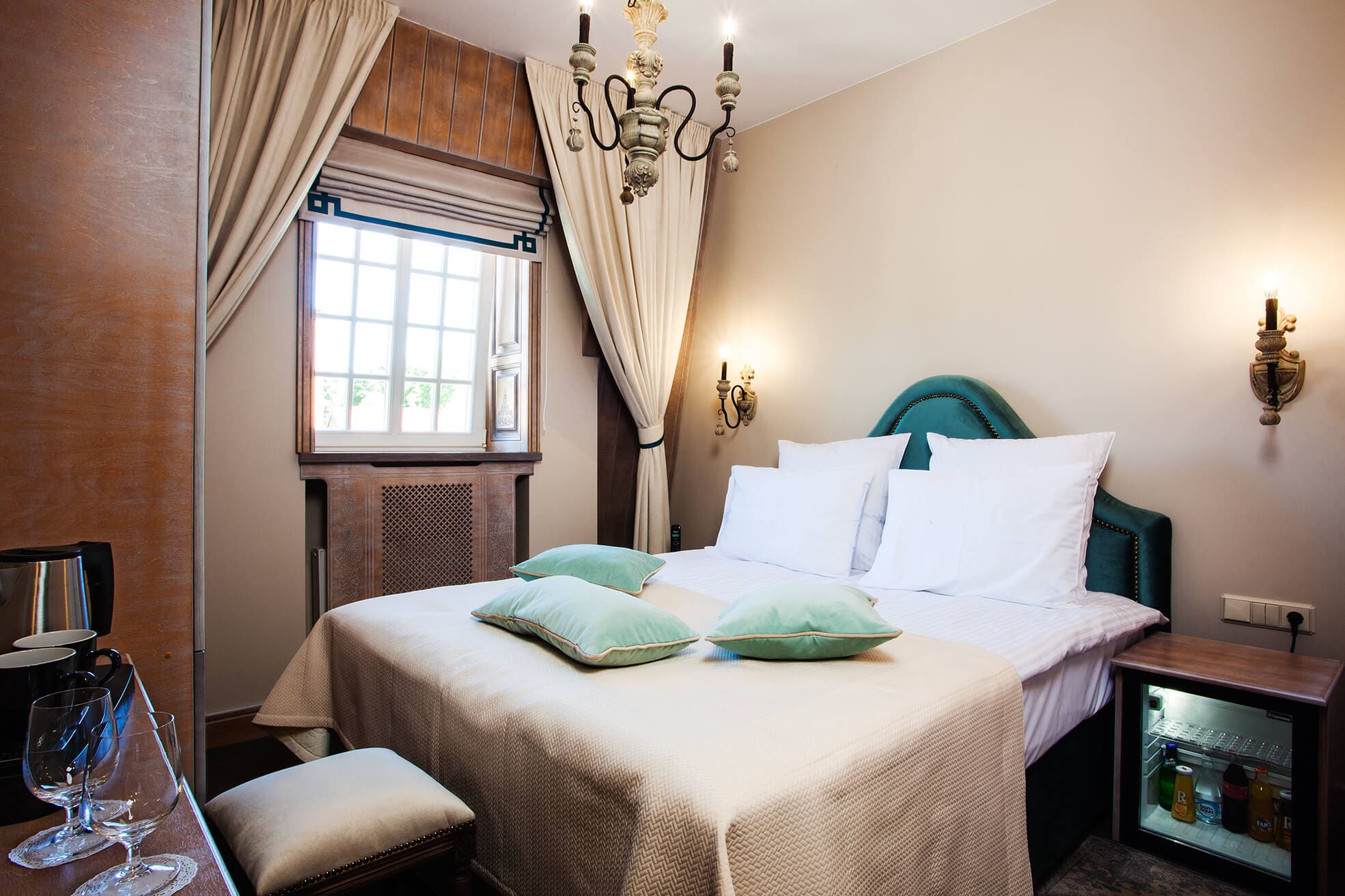 На трёх этажах расположены 15 стандартных номеров с двуспальной кроватью, один одноместный номер, два номера-люкс и две студии, а также детская игровая комната и ресторан. Колористика каждого номера индивидуальна. Пряная терракота, глубокий хвойный цвет или оттенок грозовых облаков создают особое настроение, созвучное главным тосканским мотивам – плодородной земле, яркой зелени и небесам. В отделке интерьера использованы исключительно натуральные материалы. Главные герои – камень и дерево. Стены декорированы травертином. Двери, дверные и оконные порталы, элементы мебели и декора выполнены из состаренного и словно выбеленного до волокон дерева. Брутальная фактура традиционного для Тосканы деревянного потолочного декора контрастирует с нежной, гладкой штукатуркой стен, на которую нанесены роспись «под фреску» и орнаментальные оттиски фотопринтера. Завершает аллюзию средневекового итальянского замка искусная гипсовая лепнина!