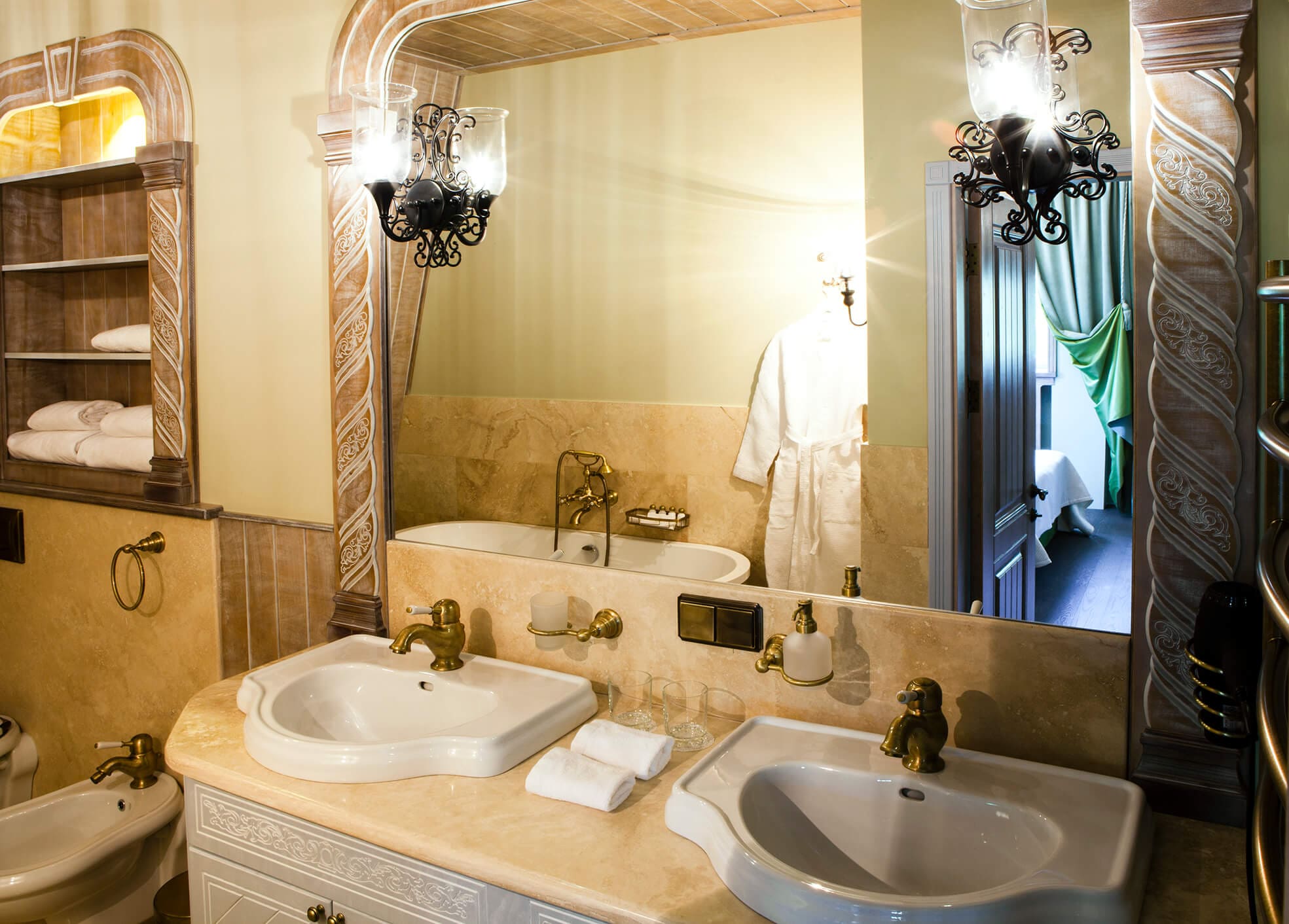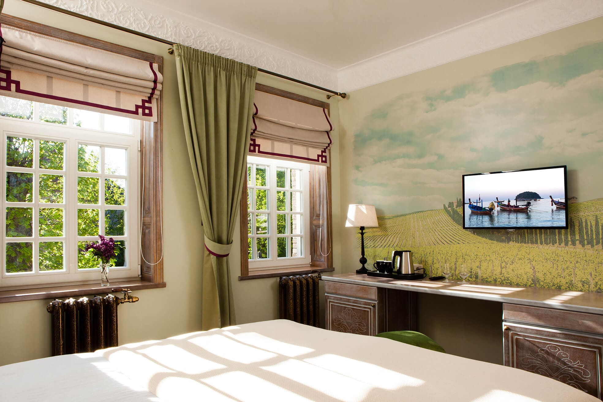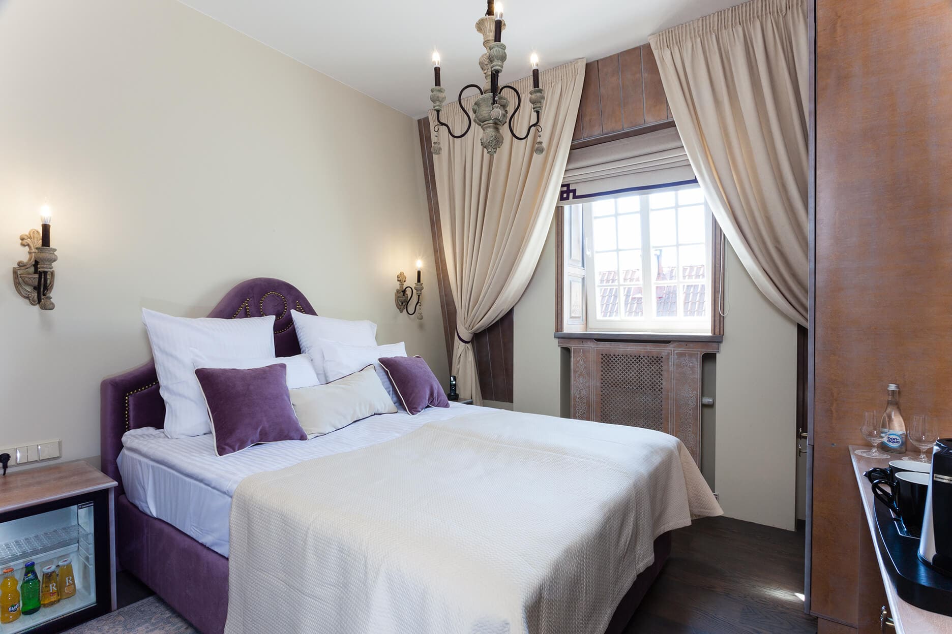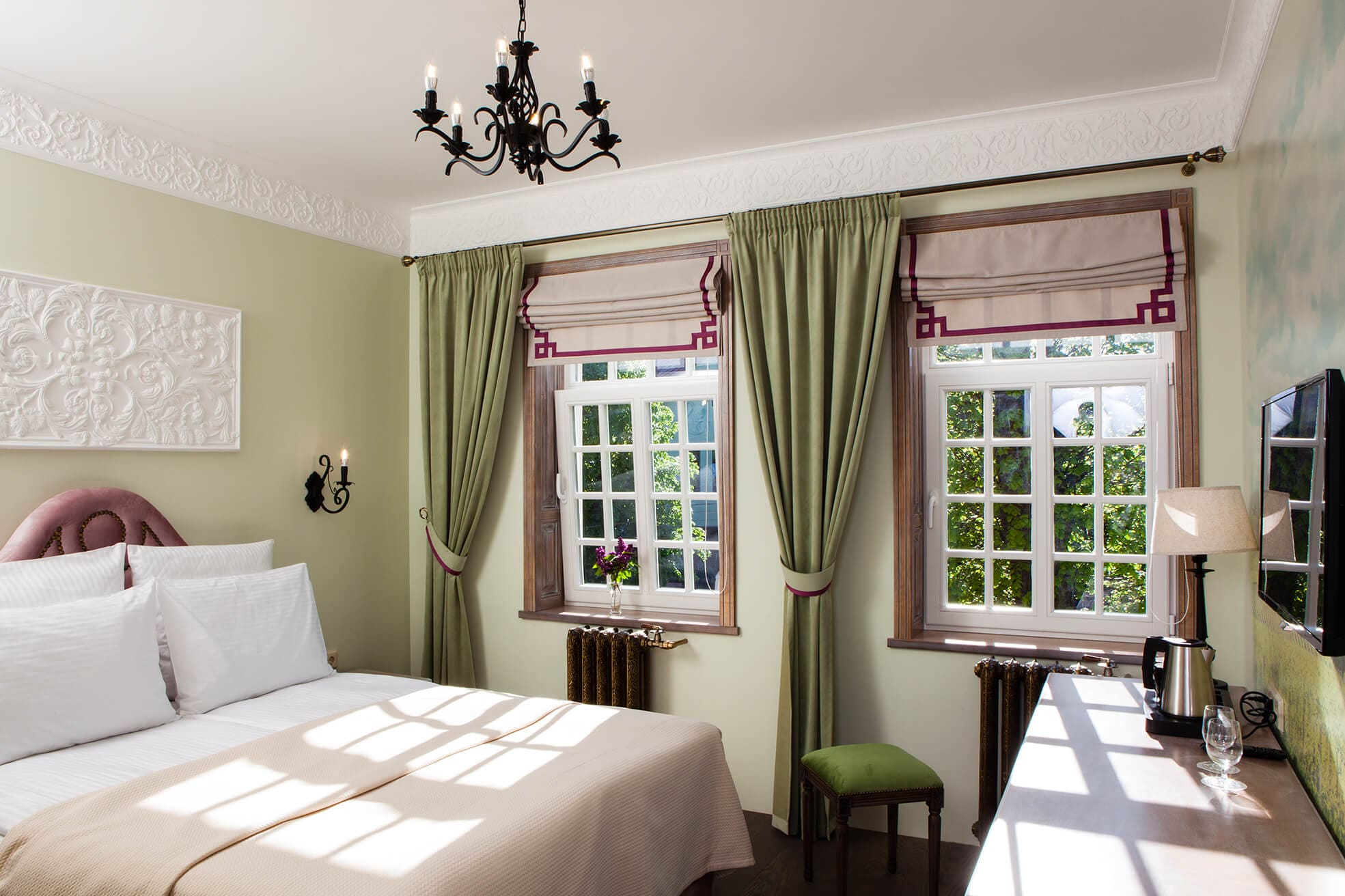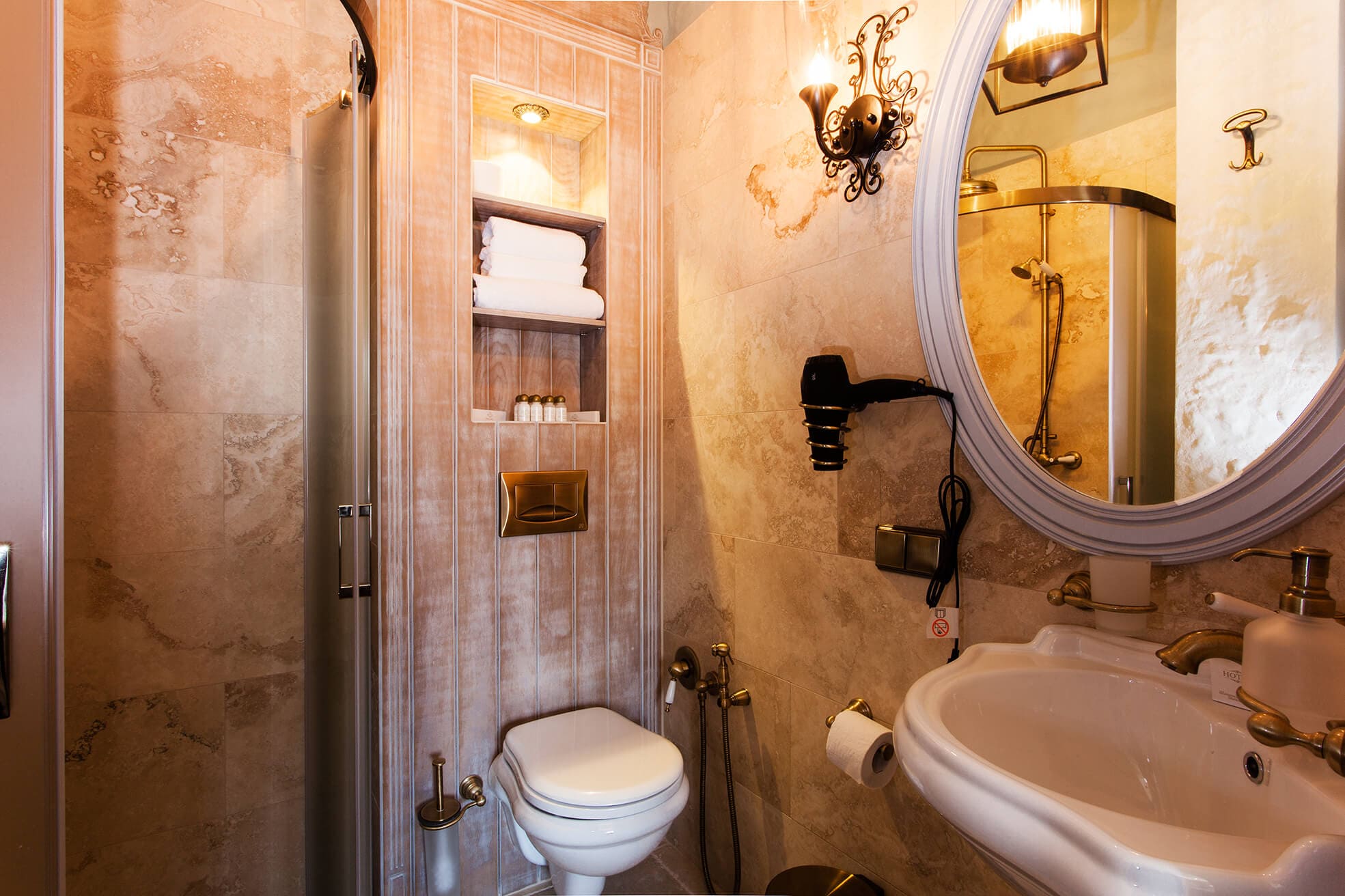 На трёх этажах расположены 15 стандартных номеров с двуспальной кроватью, один одноместный номер, два номера-люкс и две студии, а также детская игровая комната и ресторан. Колористика каждого номера индивидуальна. Пряная терракота, глубокий хвойный цвет или оттенок грозовых облаков создают особое настроение, созвучное главным тосканским мотивам – плодородной земле, яркой зелени и небесам. В отделке интерьера использованы исключительно натуральные материалы. Главные герои – камень и дерево. Стены декорированы травертином. Двери, дверные и оконные порталы, элементы мебели и декора выполнены из состаренного и словно выбеленного до волокон дерева. Брутальная фактура традиционного для Тосканы деревянного потолочного декора контрастирует с нежной, гладкой штукатуркой стен, на которую нанесены роспись «под фреску» и орнаментальные оттиски фотопринтера. Завершает аллюзию средневекового итальянского замка искусная гипсовая лепнина!