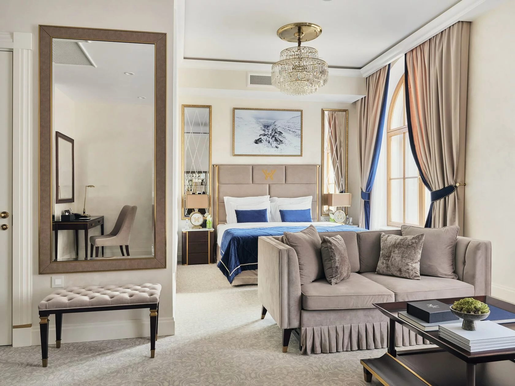 Wawelberg historical suite (177 кв. м.): балконы, 2 гостиные (одна - с обеденной зоной), 2 спальни (каждая - с кроватью king-size), ванная комната с ванной и душевой кабиной с гидромассажем и хромотерапией, гостевой туалет. Дополнительно: камин. Вид на Невский проспект и Малую Морскую улицу.