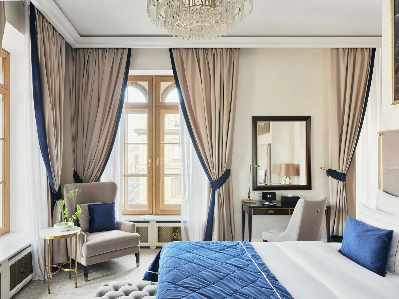 Historical junior suite (53 кв. м.): спальня с гостиной зоной (кровать king-size), ванная комната с ванной и душевой кабиной с гидромассажем и хромотерапией. Возможно объединение с номером категории Twin deluxe city view room. Вид на Невский проспект или Малую Морскую улицу.