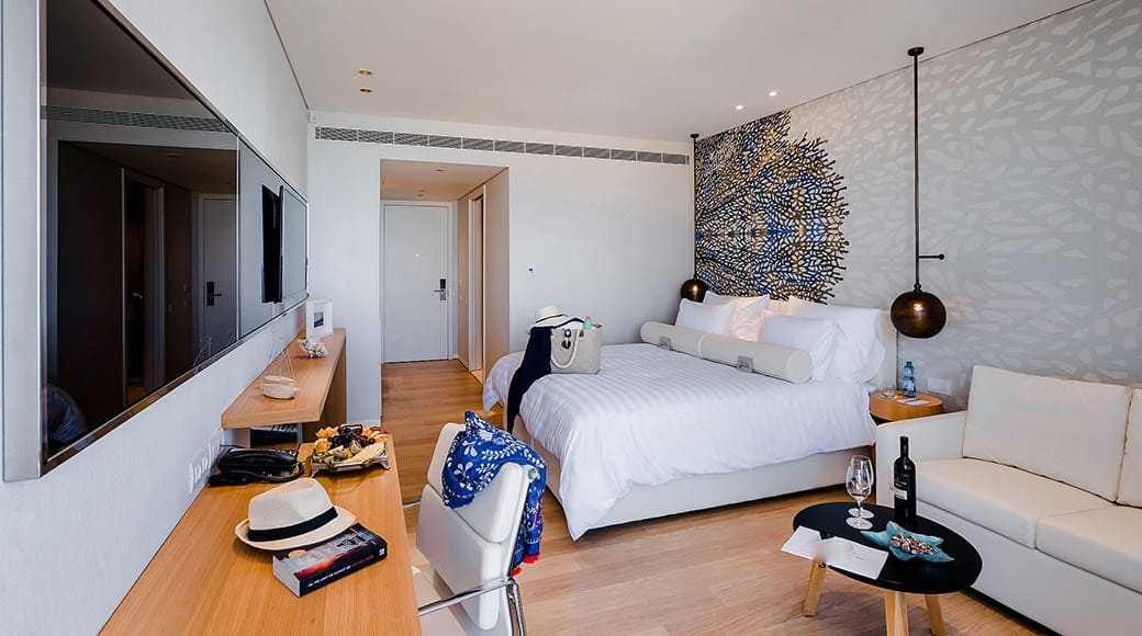 Deluxe Premium Room (32 кв. м). Балкон, гостиная зона, спальня с двуспальной кроватью, ванная комната. Вид на море.