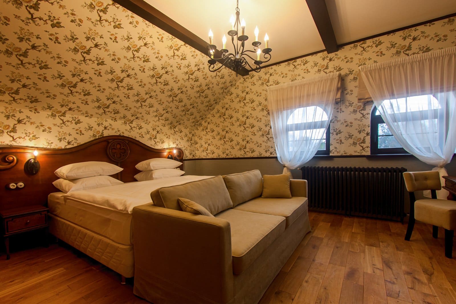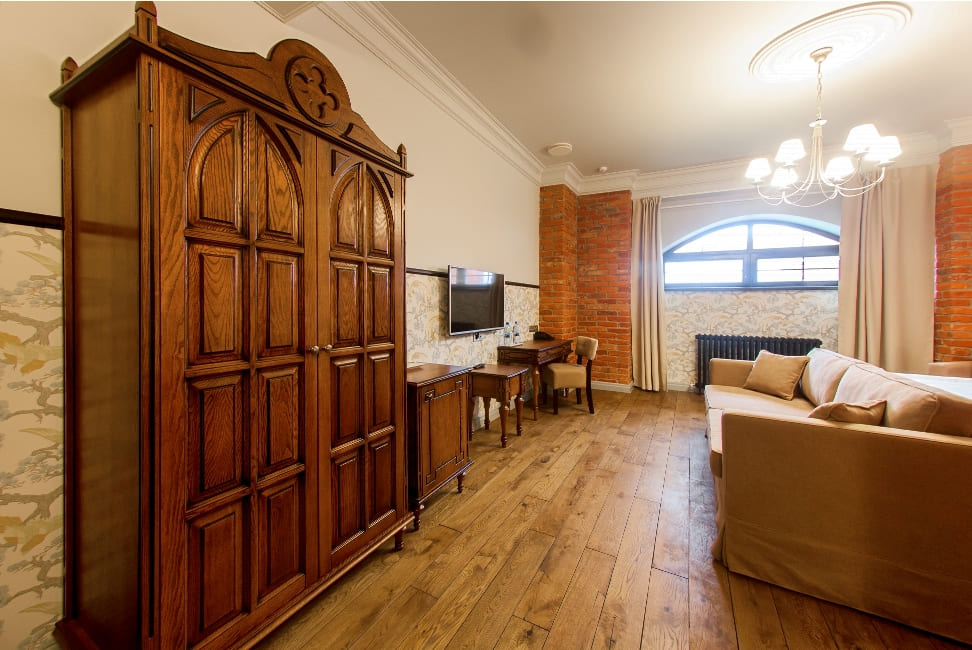 2-местный джуниор-сьют (флигель) (макс. 2+1 чел., Wi-Fi, телевизор, душ, умывальник, фен, мини-бар, телефон, мягкая мебель, туалет). Доп. место - диван-кровать, может быть установлен без ограничения по возрасту.