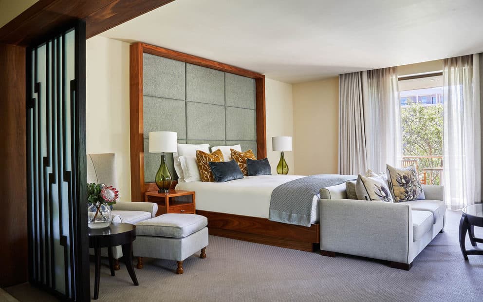 One-bedroom marina grand suite (155 кв. м). Балкон, гостиная с обеденной зоной (стол на 6 персон), спальня с кроватью king-size, гардеробная, ванная комната с душевой кабиной с функцией «тропический дождь», гостевой туалет. Расположены в корпусе Marina Rise. Вид на набережную и Столовую гору. Услуги персонального камердинера.