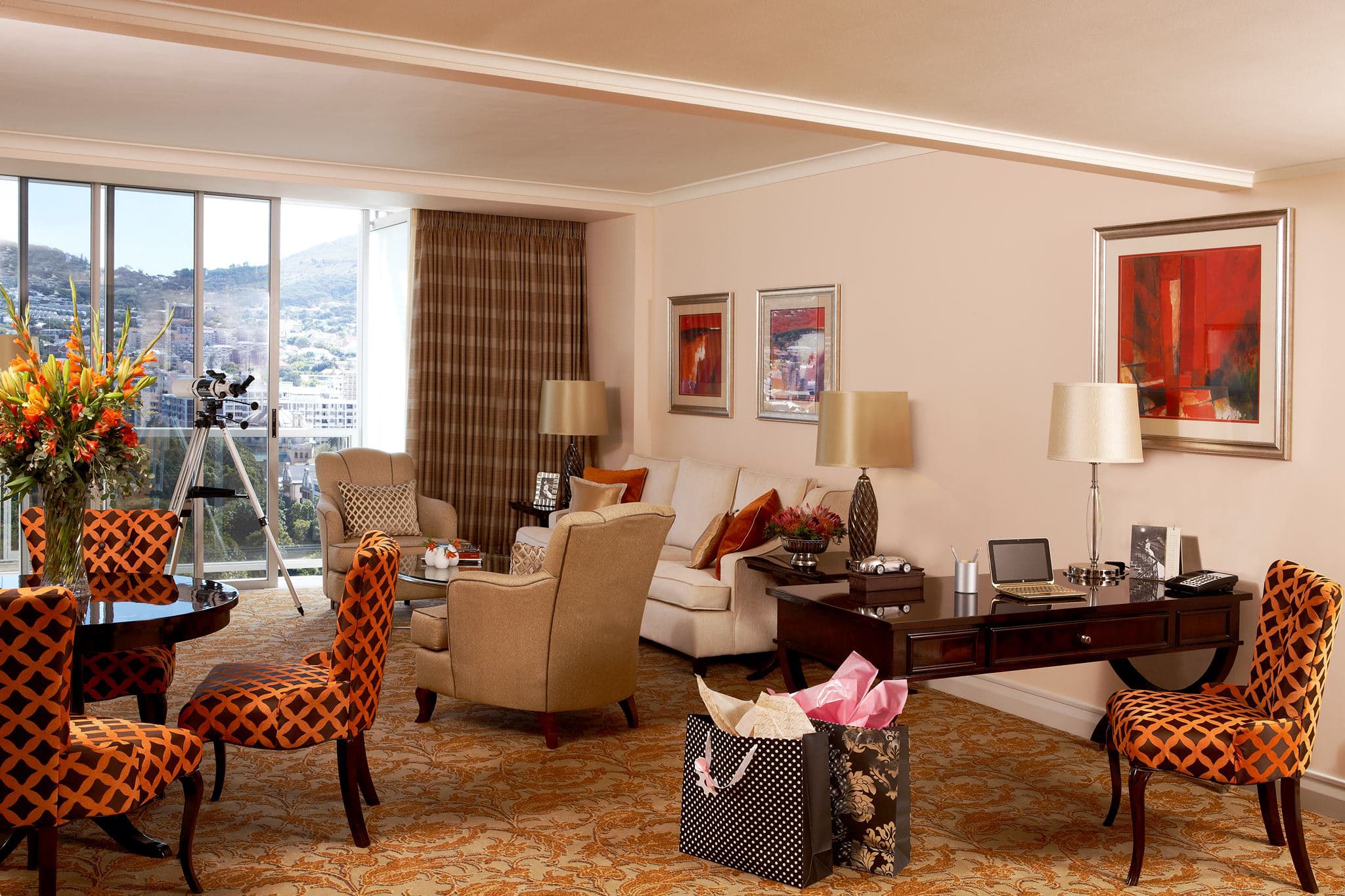 The Presidential suite (194 кв. м). Терраса, гостиная, столовая, кабинет, SPA-салон, тренажерный зал, 2 спальни, кладовая, гардеробная, ванная комната с ванной и душевой кабиной. Дополнительно: турецкая баня, парная. Расположен на 15 и 16 этажах. Вид на Столовую гору и парк Company Gardens. Гости данных номеров имеют особые привилегии.